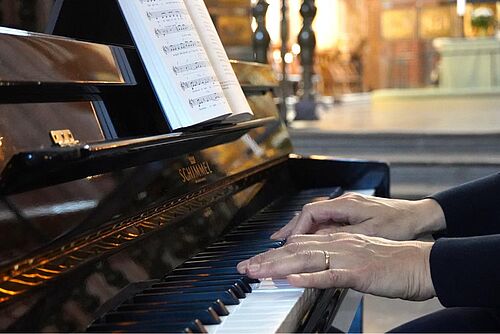 Vi synger salmer, årstidens sange og filmmusik om lys og håb. Denne eftermiddag er det en af Domkirkens egne organister, Lene Rasmussen, der har valgt sangene fra Højskolesangbogen. Jazzpianist Lars Emil Riis sidder ved klaveret.